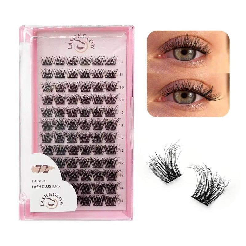 Transform your look with these premium cluster lashes from Lash&Glow. Each set includes 72 mixed-length clusters ranging from 8mm to 14mm, offering versatile styling options from natural to dramatic. Available in three stunning styles - Half Lash, Baby Doll, and Cat Eye - these soft, beautiful lashes are designed to enhance your natural beauty. The clusters are carefully crafted for easy application: simply remove them gently using tweezers, apply lash adhesive to the base, and place them under your natural lashes. Perfect for both beginners and experienced users, these clusters allow you to customize your look by experimenting with different lengths and styles. The convenient pink storage case keeps your lashes organized and protected. Whether you're aiming for subtle enhancement or show-stopping glamour, these premium cluster lashes deliver professional-quality results. For best results, handle with care and avoid contact with the waterline during application.waterline 4) Experiment with your desired sizes and style. Lash & see the Glow!