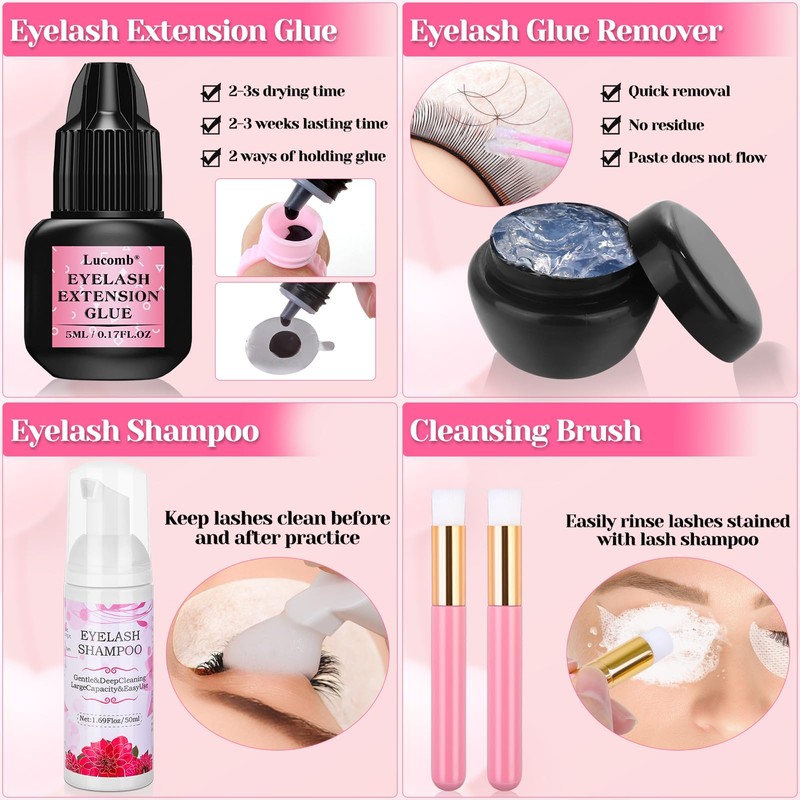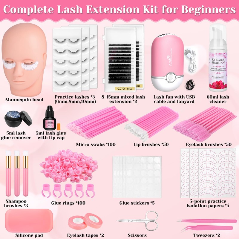 • [Lashes Kit for Practice with Everything] This lash extension kit with everything is useful for beginners or anyone who has a growing interest in doing lashes. It comes with the mannequin head, lashes clusters, lashes extension, cleaning brush, lash shampoo, rinse bottle, brush (both large small size), tweezers (both straight cured shape), fast dryer fan with usb, glue, glue remover, eyelash tape, silicone pad, glue stickers, scissors, lash positioning stickers and glue rings.