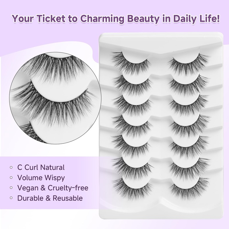 - VEGAN & REUSABLE: 7 pairs false eyelashes pack. The fake eyelashes use ultra-light synthetic fibers, cruelty-free, skin friendly. Bring pretty natural lash extensions look without damaging your own eyelashes, suit for DAY-TO-DAY use, wedding, vacation and so on