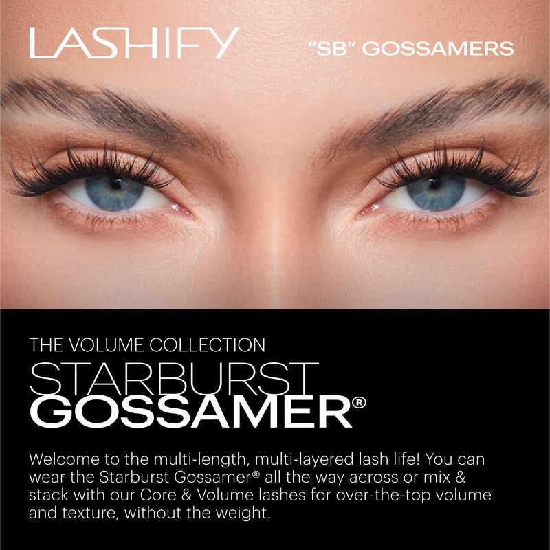 Lashify Star Burst Gossamer Eyelash Extensions Refill, from Lashify's Volume Collection is the Ultimate Multi-Length Multi Layered Lash. Achieve a Voluminous Look with Lashify's Versatile Star Burst DIY False Lashes. Easy Application and Made from 100% Premium Korean PBT Silk.