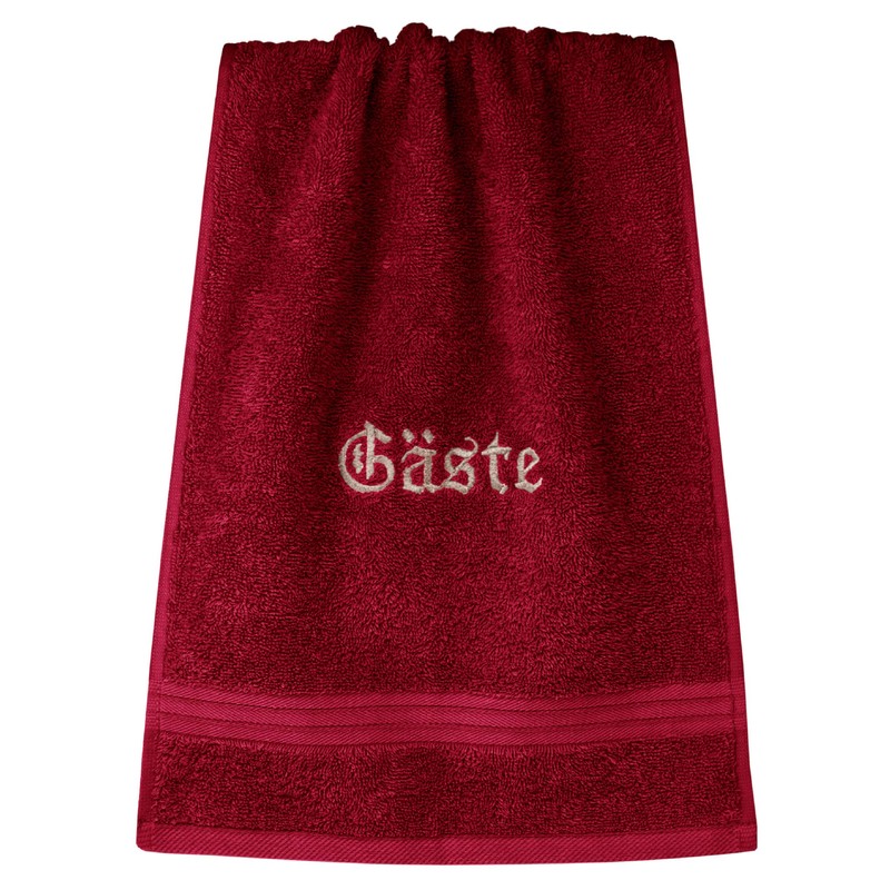 - Only the best for your guests! Embroidered 30 x 50 cm bathroom towel in ruby - red with the writing "Gäste" - perfect for use as a soft face towel or absorbent hand towel.