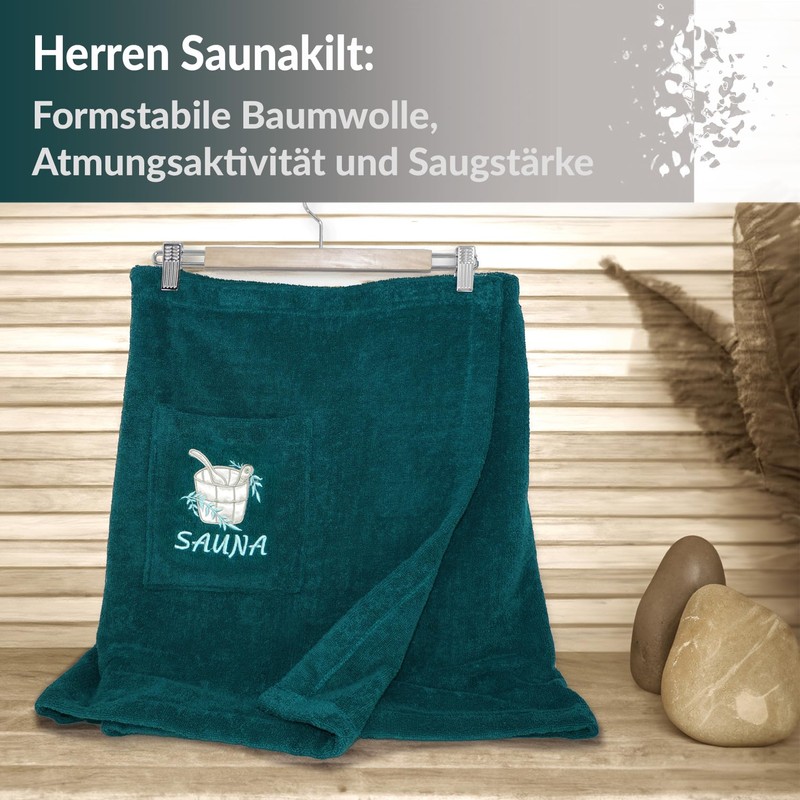 - Our opal green terry sauna kilt for little men is not only gentle and comfortable to wear, but offers with its size of approx. 130 x 55 cm optimal comfort during the sauna.
