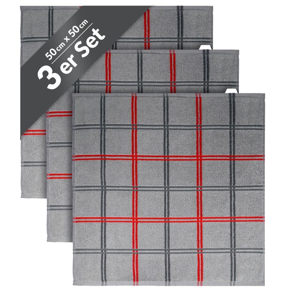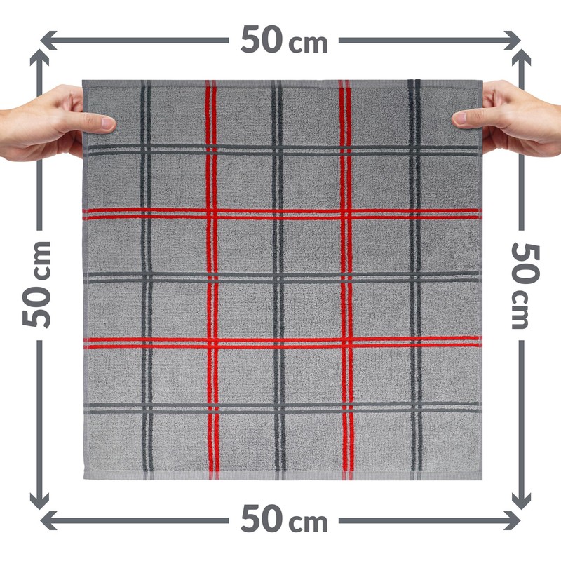 Each dish towel kitchen terry cloth measures approx. 50 x 50 cm, an ideal size for versatile use in the kitchen. The eye-catching pattern of our elegant terry dish cloths small grey with vertical and horizontal stripes in grey and red sets elegant accents and blends seamlessly into any modern kitchen decor. The combination of stone grey and the vibrant stripes makes each small tea towel striped made of cotton a decorative element, or as a women's men's fitness towel made of cotton that harmoniously combines functionality and style.