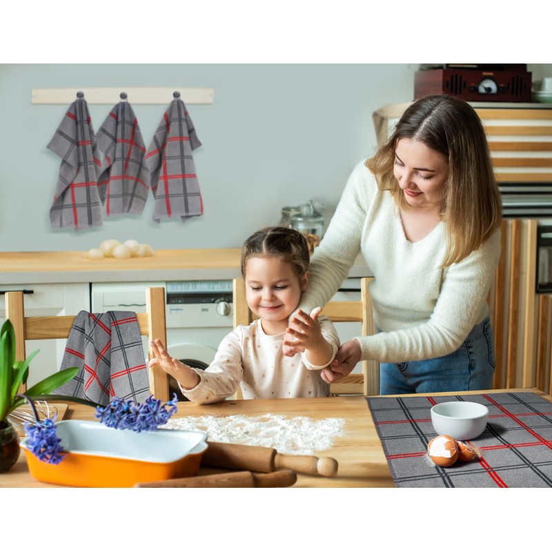 - MODERN STRIPE DESIGN The combination of stone gray with gray and red stripes gives each absorbent tea towel small practically a stylish and eye-catching appearance.