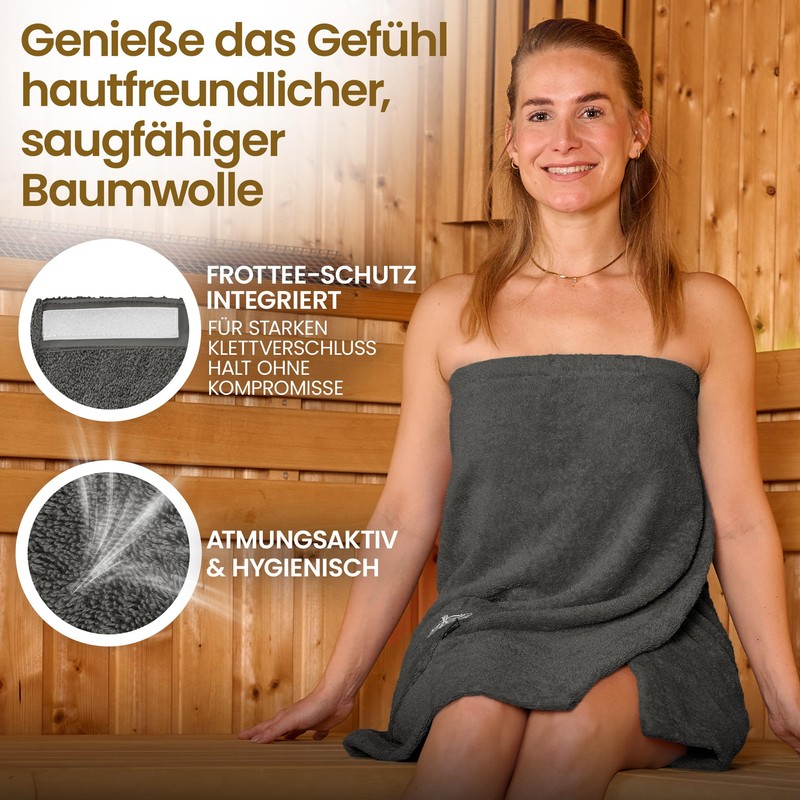 - The women's sauna kilt has a triple Velcro fastener and elastic, which makes the wrap towel for women easy and safe to wear. The sauna dress terry cloth is woven in stone grey.