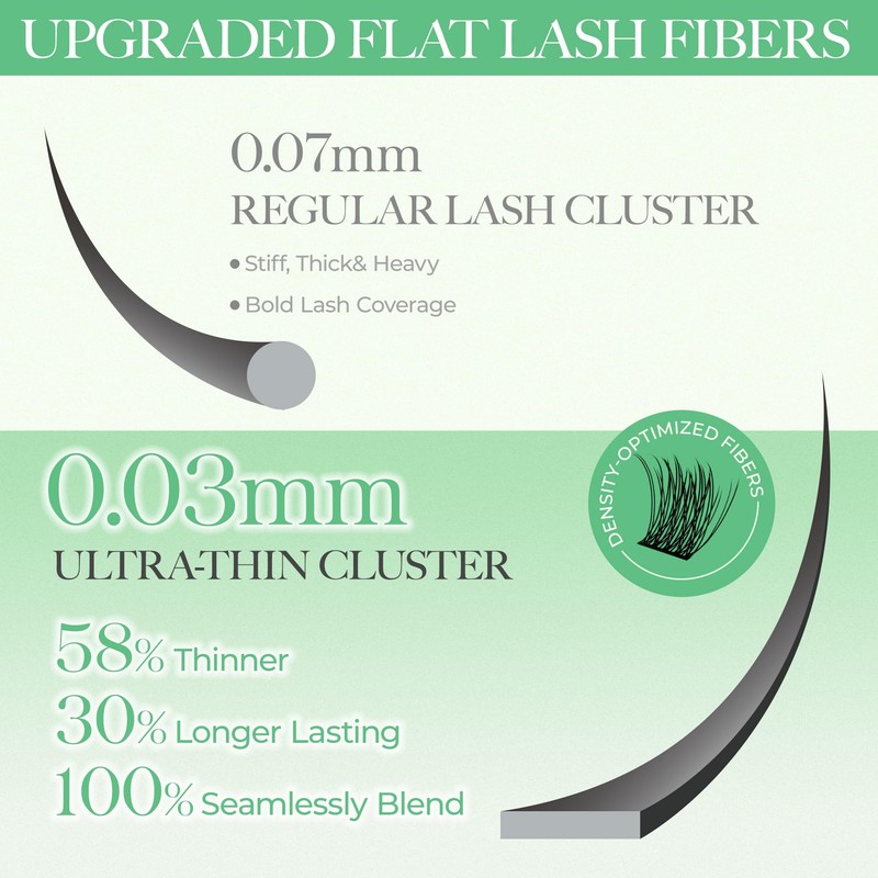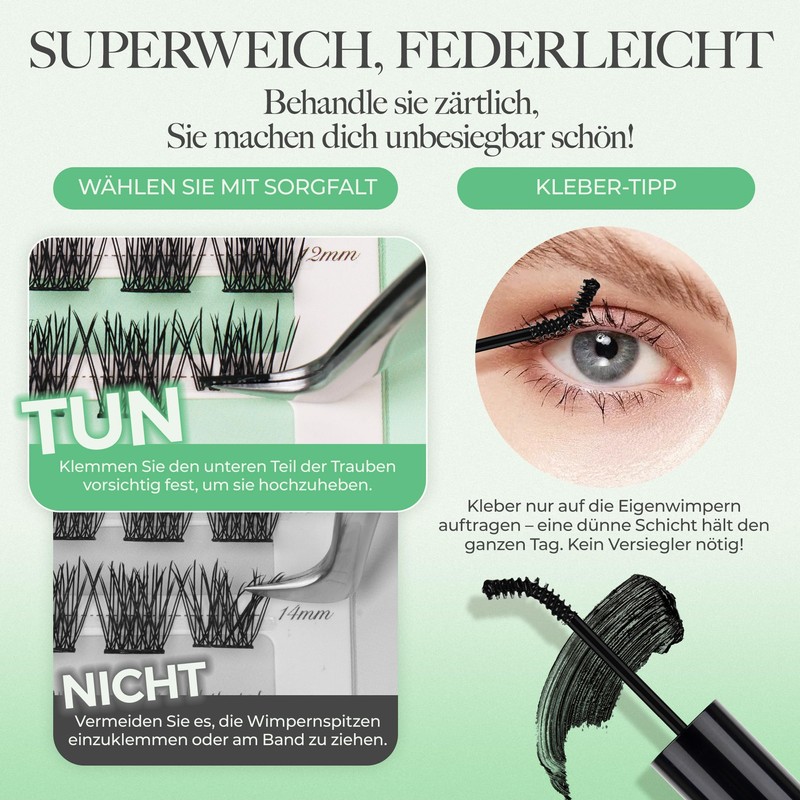 • 【100% Leichtgewicht, Kein Druck】Unsere innovativen 0,03-mm-VelvetThin-Cluster-Wimpern sind 60% leichter als Standardprodukte. Für ein "als-wäre-nichts-da"-Gefühl den ganzen Tag – ohne Schweregefühl oder Herunterziehen