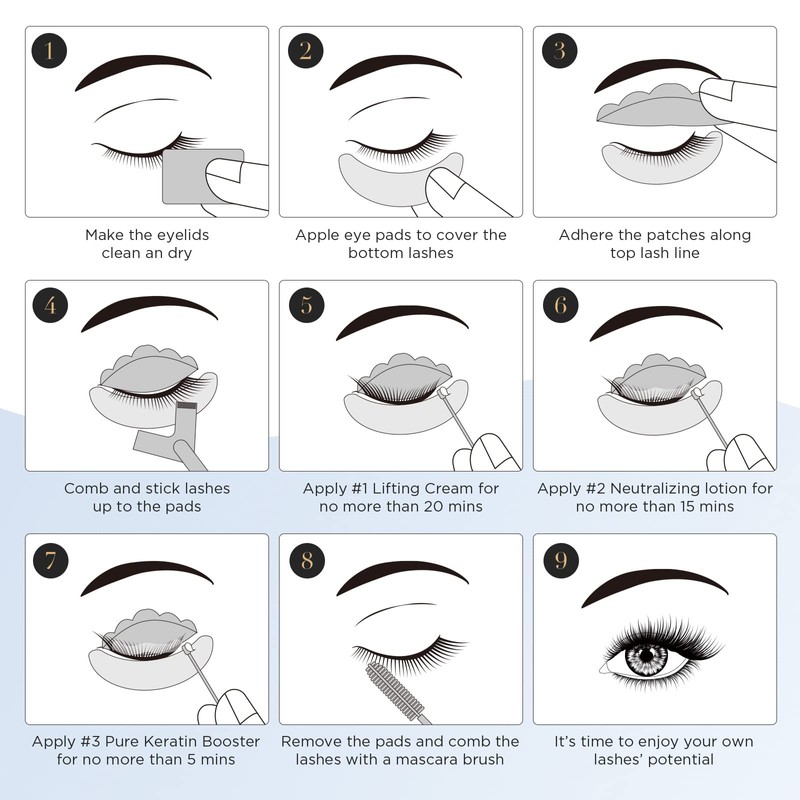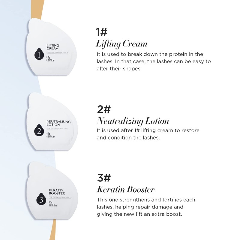 - ENOUGH FOR 10 APPLICATIONSLifting Cream *10pcs, Neutralizing Lotion *10pcs, Keratin Booster *10pcs, Lash Shields (S/M/L) *6pairs, 3-In-1 Wand *1pcs, 3D Eye Pads *10Pouches , Micro Brushes *25pcs, Mascara Brushes *15pcs, Ring Cups *50pcs