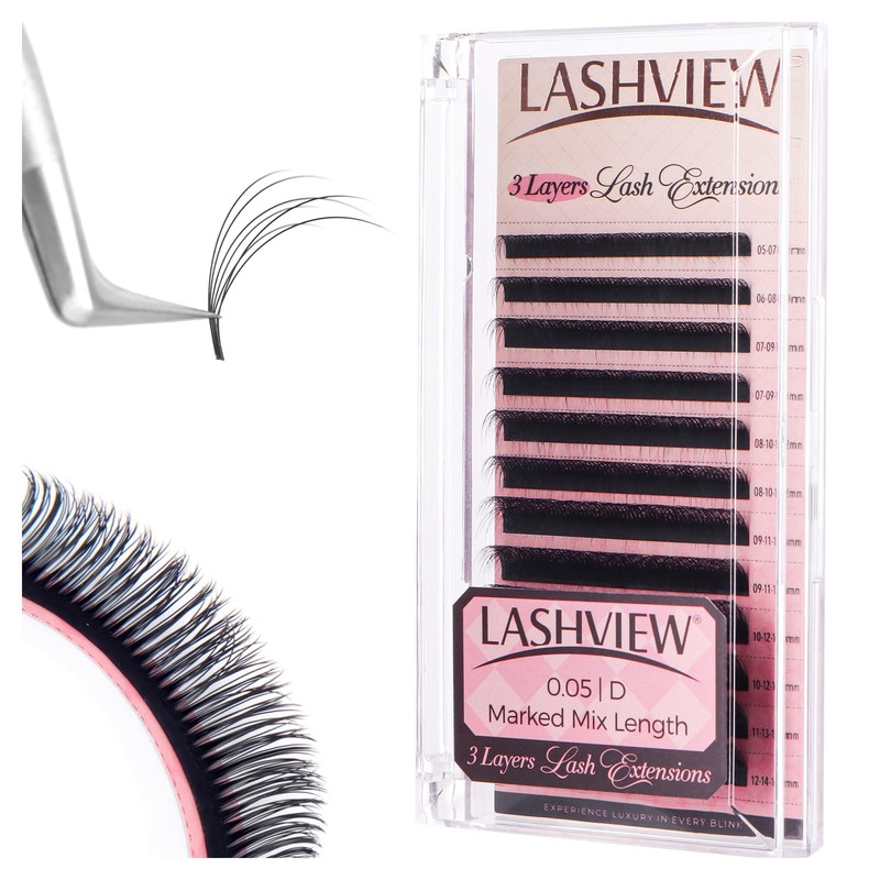 LASHVIEW Volume Lash Extensions 3 Layers 0.05/0.07 C/D/LD/LU/M Curl Three Mixed Lengths Per Row Natural and Realistic Effect Lash Tray(0.05 D 14-15-16mm Mix)