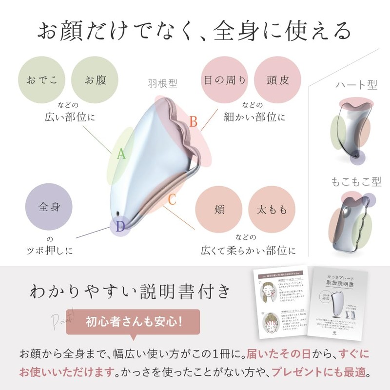 - Can be used for the whole body. A chassis plate that can be used not only on your face, but also on your body. Forehead, stomach, eye circumference, scalp, cheek, thigh, and pressure points on all body are included (English language not guaranteed) for beginners to use. A wide range of uses for the Kasa Plate from your face to the whole body. You can use it as soon as you receive it