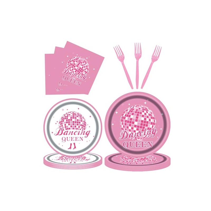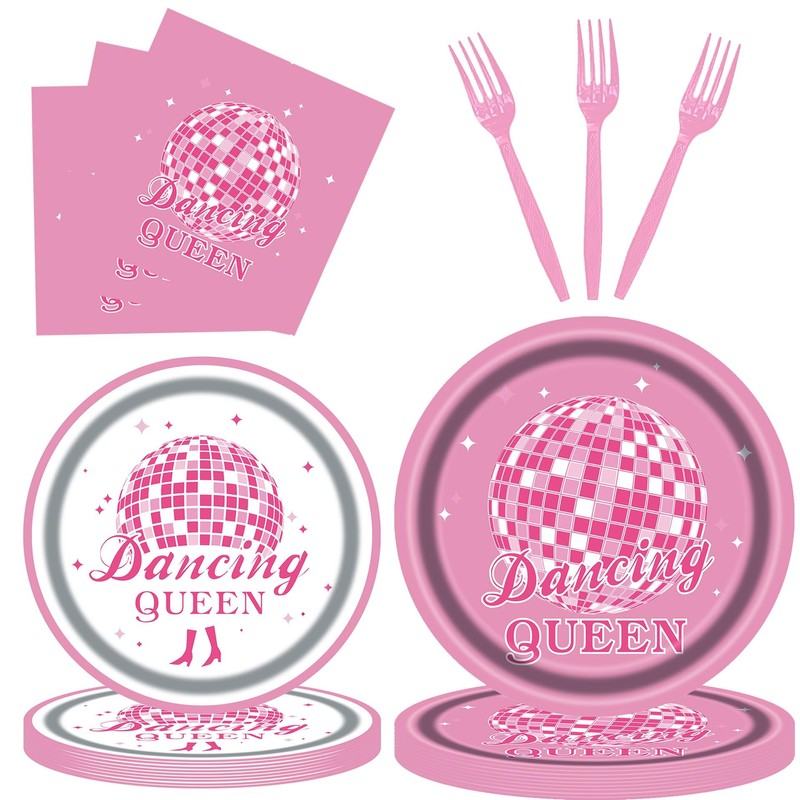 - You can get:This disco theme party tableware supplies includes 24 paper plates (7"),24 paper plates (9"),24 napkins (6.3") and 24 forks.The70s disco birthday party plates and napkins can serve for 24 guests.