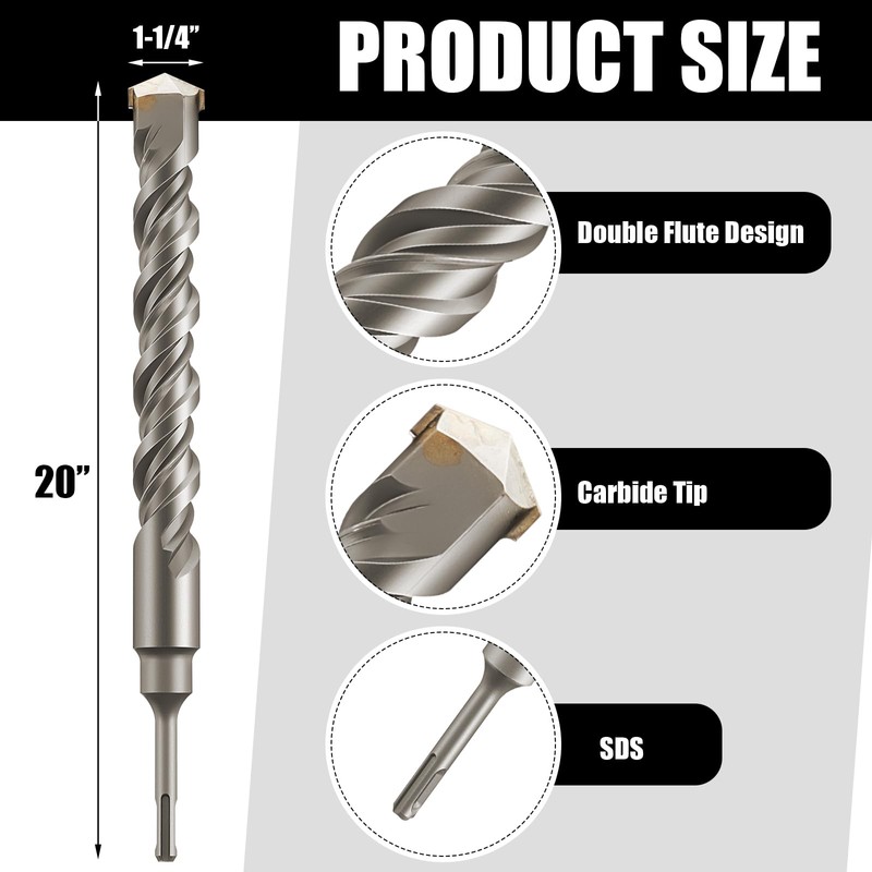 - Precision Size: this versatile rotary hammer drill bit with a precise size of about 1-1/4 Inch x 20 Inch assures fulfilling all your drilling needs with ease; It's ideal for diverse applications and serves as a one-stop solution for all your drilling tasks
