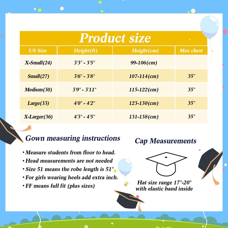 - The Right Size: gown size should be determined by your chest and height; Measure your height from the floor to the top of your head, and then choose according to our size table; The normal size is to the calf, if you like to go to the ankle, you can buy a larger size, the cap is elastic, suitable for most children