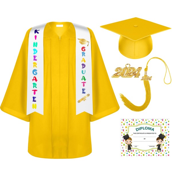 Lasnten Unisex Matte Kindergarten Graduation Gown Cap Tassel Set with 2025/2026 Charm Printed Stole for Kid Grad Gift(36,Yellow)