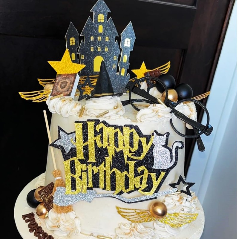 - Package Included: 1 x Castle Decor, 12 x Stars, 1 x glasses Decor, 10 x ballsblackgolden, 5 x wings1 X Broom Decor1 x Wizard hat Decor1 X Happy birthday topper.
