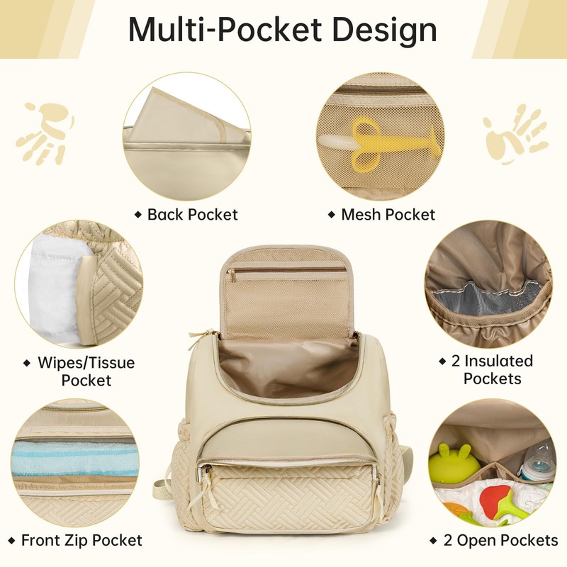 LASUK Diaper Bag Small Diaper Backpack, Stylish Quilted Baby Backpacks, Mini Maternity Bags, with Changing Pad, Pacifier Case & Stroller Straps, Parents Essentials Diaper Bag, Light Beige