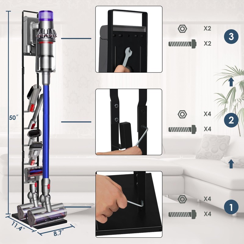 - 【STABLE DESIGN, STURDY MATERIAL】 Heavy base(11.5*8.7inch), 50” height cordless vacuum cleaner holder,4 screws connecting metal frame at the bottom, 2 legs frame structure make cordless vacuum stand safer, more stable and durable.