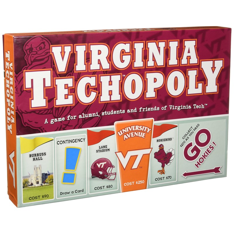 This VA TECHOPOLY board game is perfect for Virginia Tech alumni, students and future grads. Tokens include: alarm clock, pencil, gym shoe, bicycle, and graduation cap. Board Spaces include: Burruss Hall, Newman Library, Lane Stadium, Cook's Laundromat, Hokie Bird, Drill Field, and College Avenue.