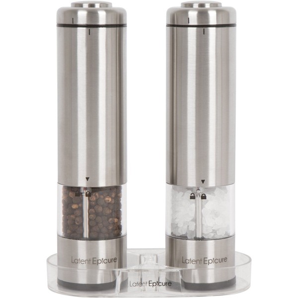 Latent Epicure Electric Salt & Pepper Grinder Set – Battery Operated Stainless-Steel Mills & Shakers with Light, Adjustable Ceramic Grinders & Acrylic Rest Tray