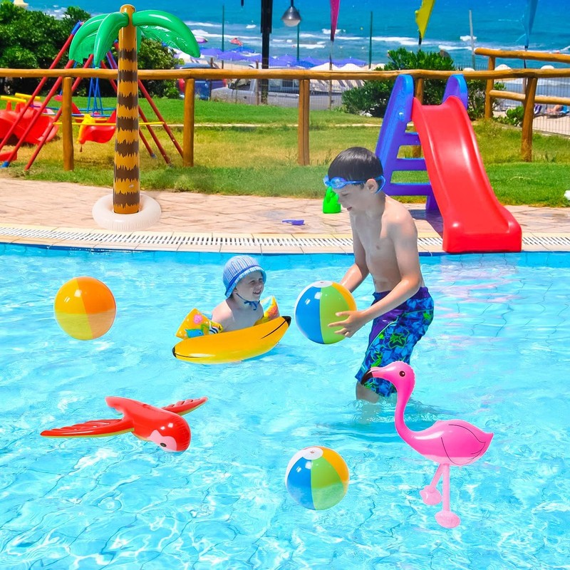 - [Inflatable toy set] Each package comes with 2 inflatable palm trees, 1 pink inflatable flamingo water toy, 1 blue dolphin, 1 red parrot,1 yellow inflatable banana, and 4 beach balls, 1 air pump