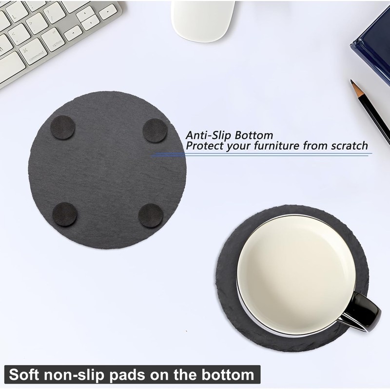 LATERN Pack of 4 Slate Coasters, 10 cm Round Black Stone Engraved Blank Cups Coasters Natural Rough Edge with Scratch-Resistant Base for Drinks Coffee Bar Kitchen Home Decor