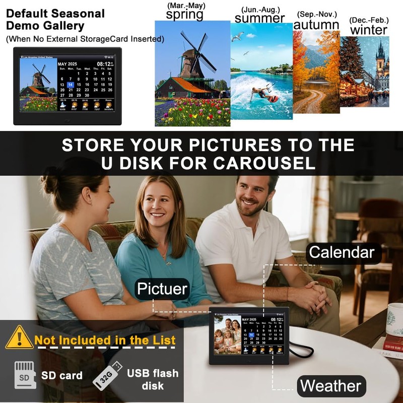 - 【Network Clock Function】: By connecting to a wireless network, the clock automatically updates the time, eliminating the need for manual time adjustment, which is very user-friendly for the elderly. Additionally, it can read and play pictures and videos from a USB drive (supports up to 32GB capacity). Note: It cannot play online videos.