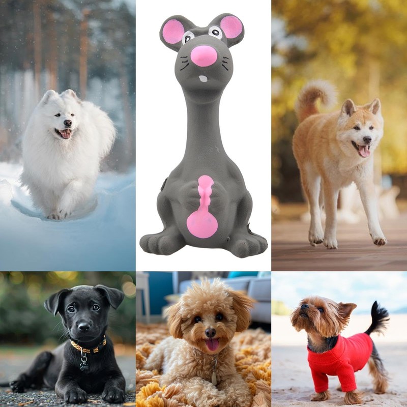 - ADD MORE ENTERTAINMENT VALUE With a realistic grey mice design, this latex chew toy will add extra fun to your puppy's playtime. Squeezable with playful squeaks that captivate their interest, it promises endless entertainment.