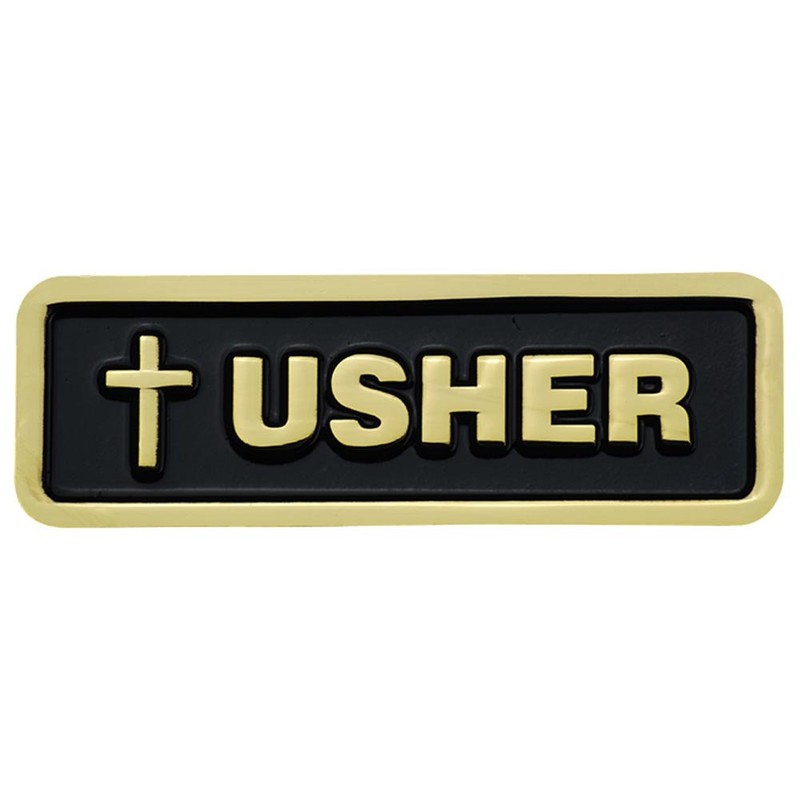 Latin Cross Usher Badge, 1" x 3", Gold Plated with Black Enameling, Magnetic or Pin Back Available, Poly Bag Packaging.