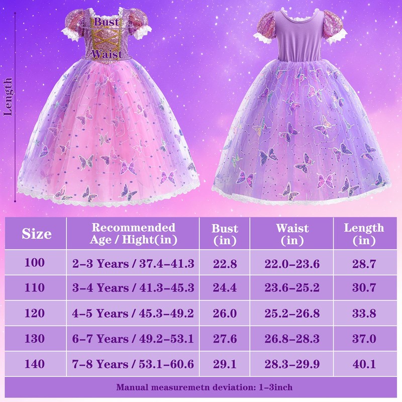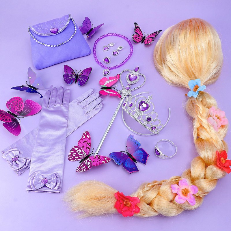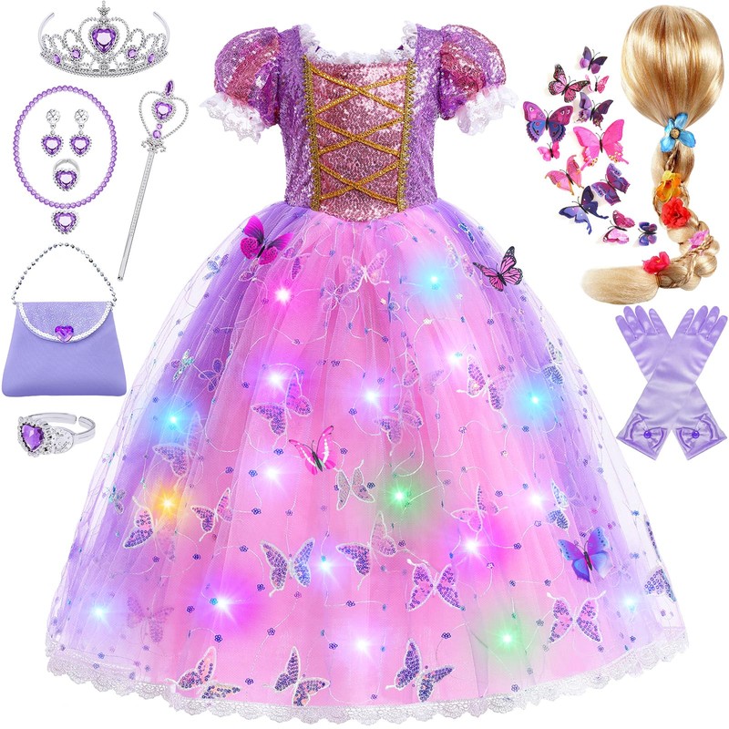 - 24 PCS Light Up Rapunzel Dress for Girls: Our girls princess dress set includes light up princess dress and wig, princess bag, necklace, gloves, earrings, ring, butterfly pin, bracelet, princess crown and wand. Day or night, our light up princess dresses make your girl the most beautiful and dazzling Rapunzel