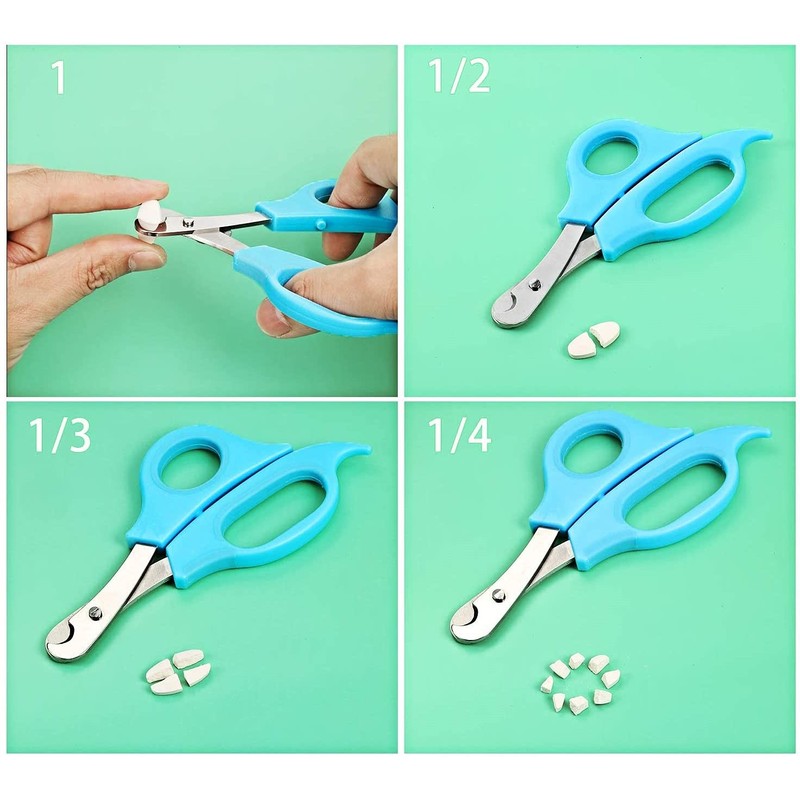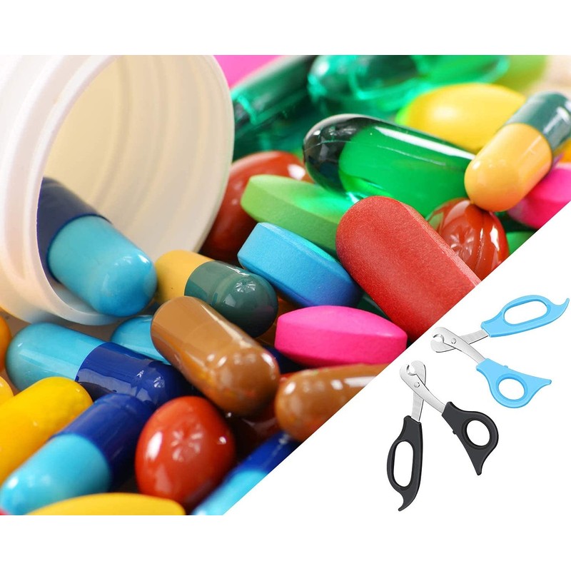 - This pill scissors features an ergonomic handle design, one side is longer, with a hook to place the tail finger, another side is round and narrow to place the thumb comfortably. Suitable for left and right hand. Easier for you to cut hard tablets, will bring you a nice experience.