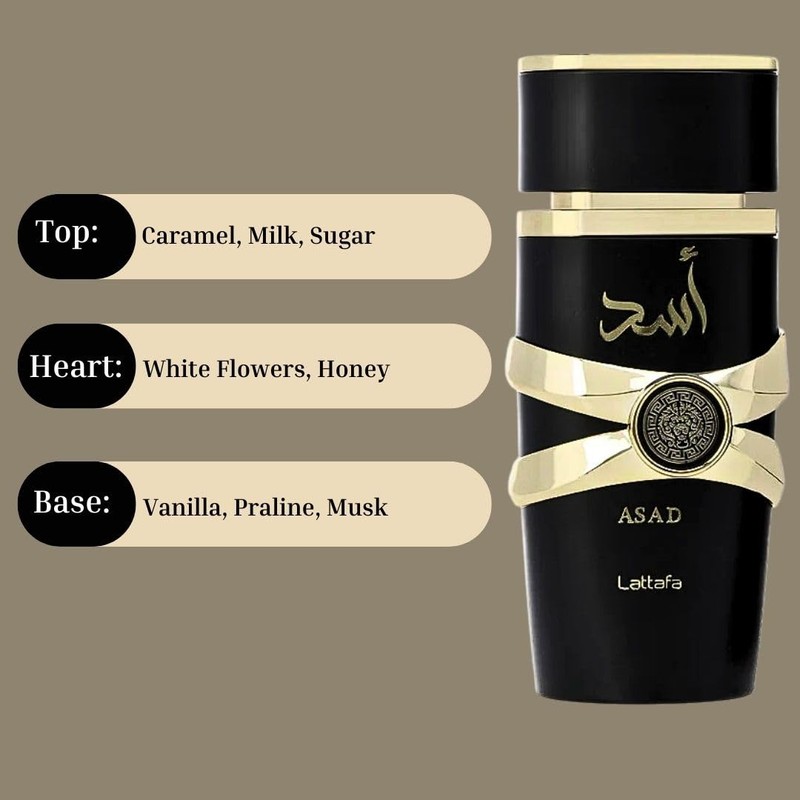 - Asad EDP 100ML (3.4 OZ) By Lattafa This fragrance opens with a bold and intriguing blend of spicy black pepper, juicy pineapple, and rich tobaco, creating a striking and unique introduction.