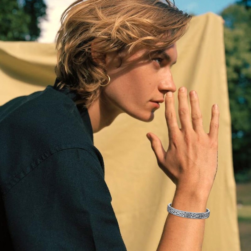 - [Celtic Knot Cuff Bangle]- Meticulously crafted, the bangle features an intertwining Celtic knot design that represents eternity and interconnectedness, making it a meaningful and stylish accessory for men.