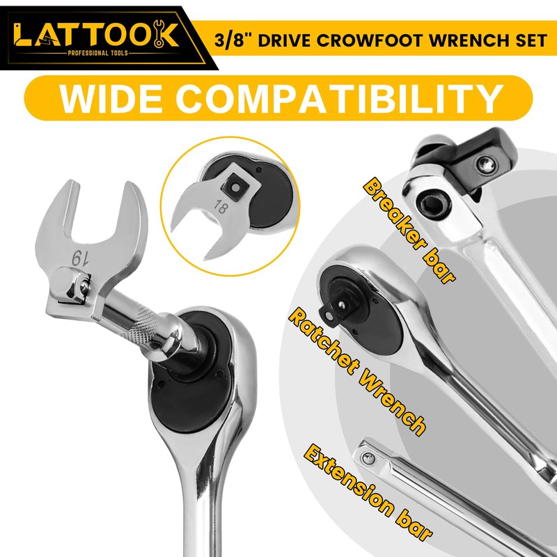 LATTOOK 3/8" Drive Crowfoot Wrench Set, 10-Piece Metric Crows Foot Wrench Set with 2 Extension Bars, Access Fasteners in Tight Spaces, 10, 12, 13, 14, 15, 17, 18, 19mm