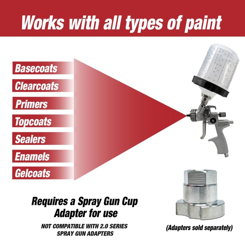 • Package Includes: 50 cups liners at 20 ounce (600ml) fluid capacity, 50 lids with built-in 125-micron fluid strainers, 20 sealing plugs, and 1 hard cup with 1 retainer ring. The disposable spray gun cup system's outer hard cup connectors are compatible to work with all original styles of 3M PPS series spray gun adapters. Cannot be used with the new 3M PPS 2.0 series spray gun adapters. An adapter is required to use the system with most spray guns (not included).