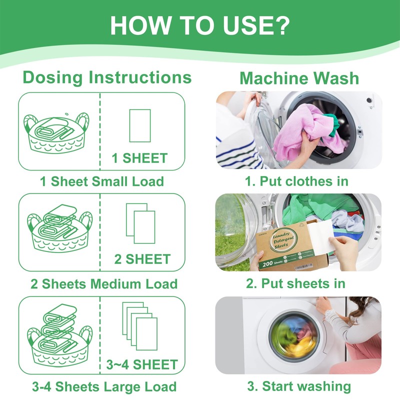 - 200 Laundry Detergent Sheets: Affordable 200 laundry sheets for as low as $0.06 a load, each pre-cut and pre-measured, just put the sheets and laundry in the washing machine. (200 sheets = 200 small loads, or 2 sheets for larger loads)