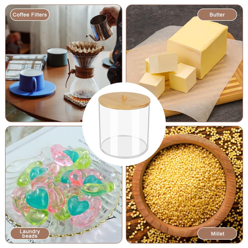 - Widely Spread:This large capacity container with bamboo lid can be used not only in washrooms, but also in different scenarios, and its location can be found in many rooms at home. Used to organize your bathroom, store cotton swabs, floss and shower accessories; Used to store coffee capsules, coffee filters and creams,Used in kitchen to store snacks,sweets,cookies and cereals.
