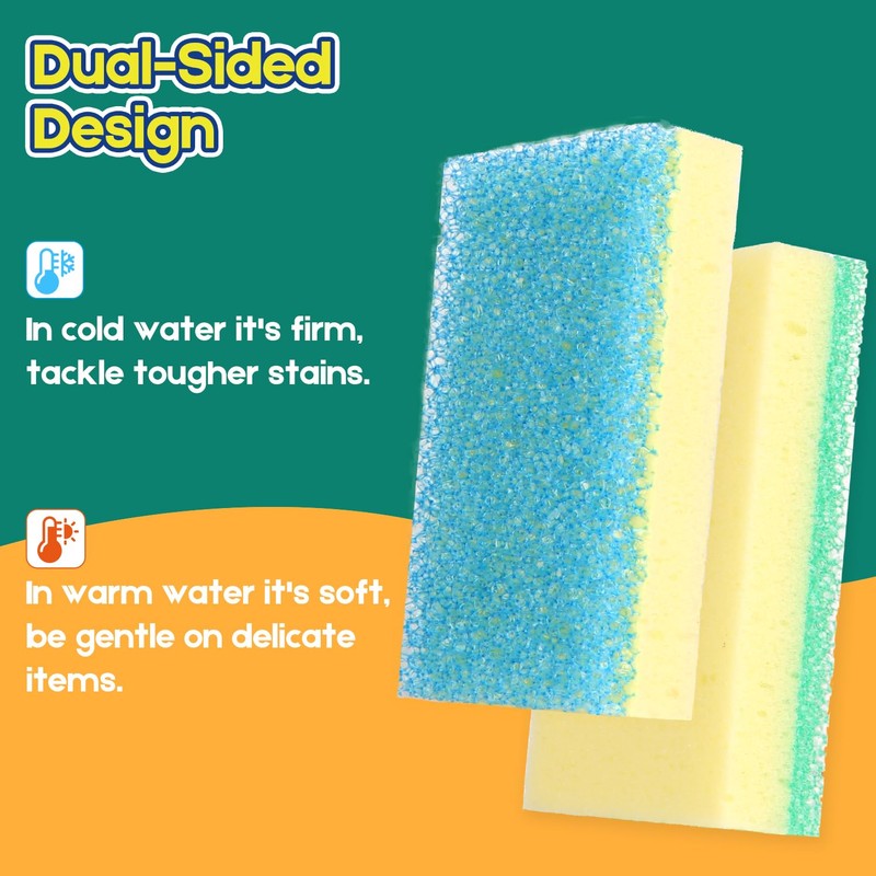 • Temperature-Adaptive Technology: The scrubber side of the sponge is uniquely designed to respond to water temperature. It softens in warm water for gentle cleaning and firms up in cold water for tackling tougher grime