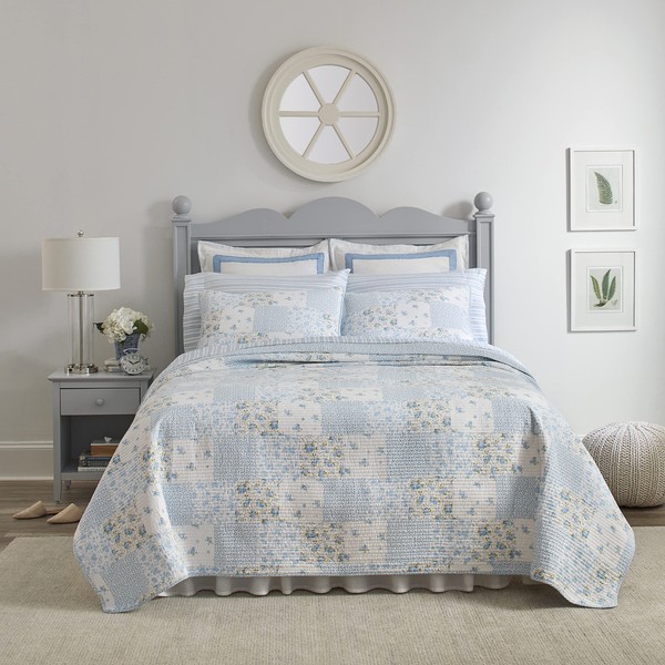 Laura Ashley - Queen Quilt Set, Cotton Reversible Bedding with Matching Shams, Bedroom Decor Ideal for All Seasons (Kenna Blue, Queen)