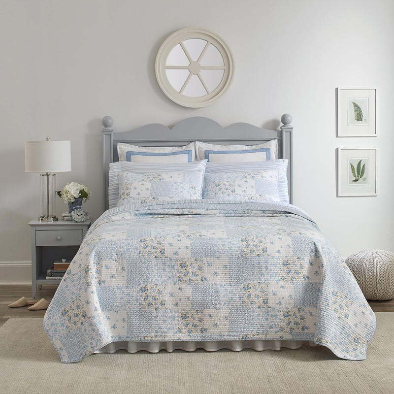 This soft, pre-washed cotton quilt set brings together a medley of small-scale floral prints in a classic block pieced patchwork to create a charming cottage look that works anywhere. The fresh, monotone palette of blue and white along with thin, horizontal channel quilting gives a modern edge to this airy mix of vintage prints. The quilt reverses to one of the coordinate print components that also trims the edges of the quilt and shams for a clean, tailored finish.