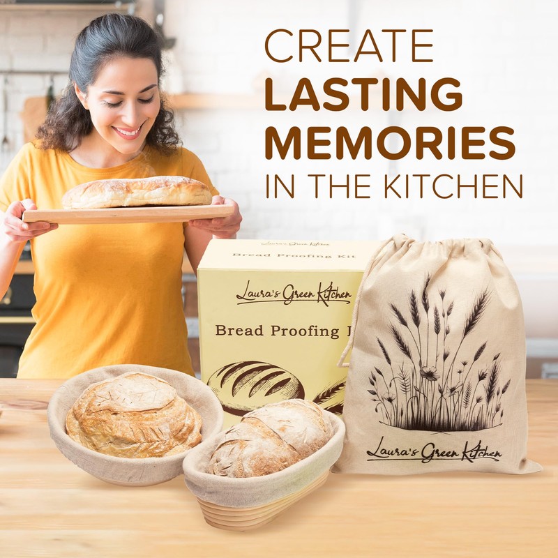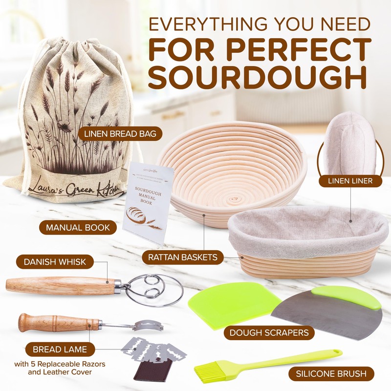 Laura's Green Kitchen Complete Sourdough Starter Kit – Sourdough Bread Baking Supplies with 2 Banneton Bread Proofing Basket, Linen Liners, Bread Lame, 5 Bread Blade for Scoring Dough, Scraper & More