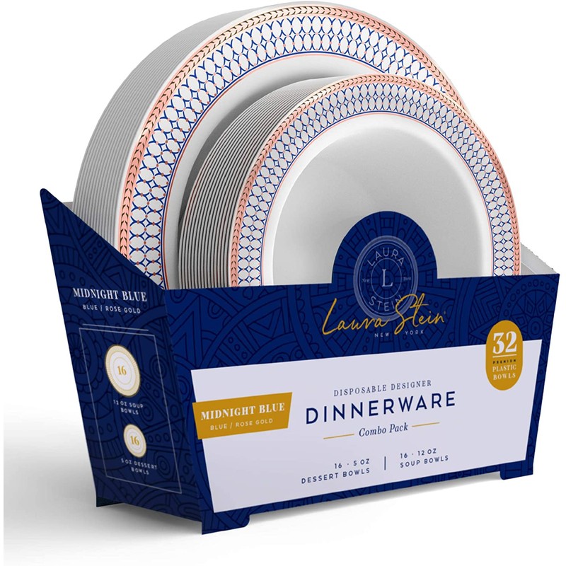 Laura Stein Designer Dinnerware Set | 64 Disposable Plastic Party Bowls | White Wedding Bowl with Blue Rim & Rose Gold Accents, Includes 32 x 12 oz Soup Bowls + 32 x 5 oz Dessert Bowls | Midnight Blue by Laura Stein Store