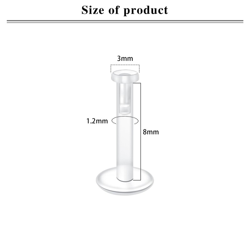 • Gauge Size of Lip: 16G(1.2mm); Length: 8mm; Size of Top: 3mm; Gauge Size of Nose: 20G(0.8mm); Length: 7mm; Size of Top: 2mm;