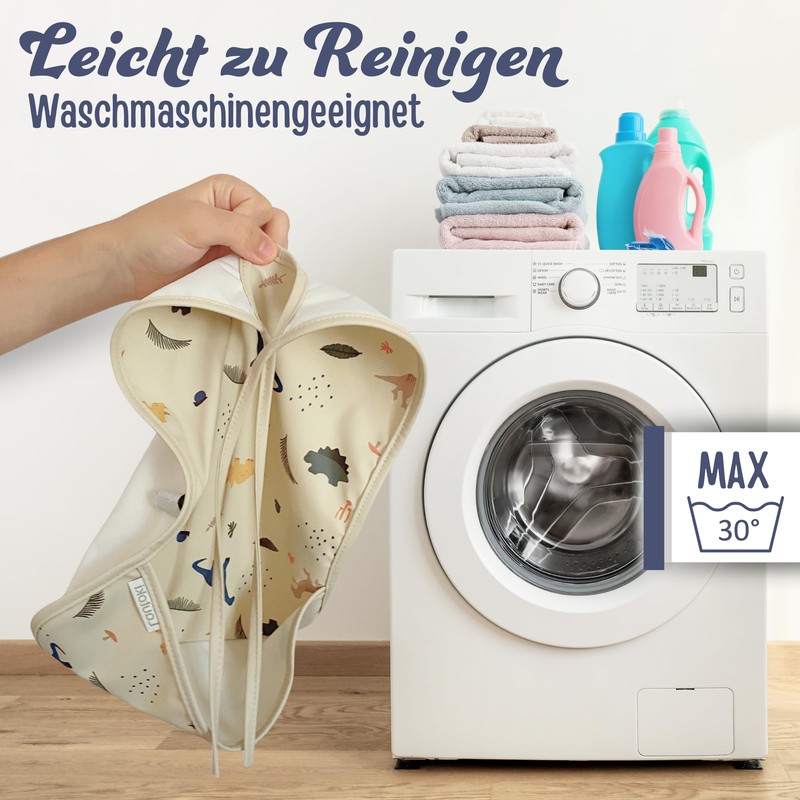 - BPA free and machine washable - Parent-friendly design: whether after eating or painting - this baby accessory can be cleaned with a damp cloth or at 30 °C in the washing machine. Thanks to the high-quality materials, it dries quickly and remains dimensionally stable even after many washes. The baby bib with drip tray remains hygienic and always ready to use. It contains no BPA and is therefore completely safe for your child. A practical companion for stress-free everyday life.