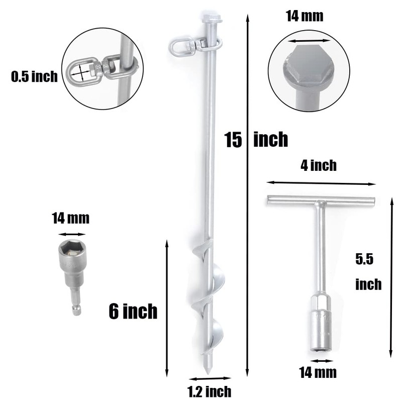 - Specifications: Made of solid steel with anti-rust and anti-corrosion silver power coating. Ground anchor size: 15 inch long, 14mm socket, 9mm diameter solid steel shaft with 1.2 inch wide Helix, 0.5 inch x 0.5 inch Loop. T-handle Hex Wrench size: 5.5 inch long with 14mm Power Nut Driver. Power Nut Driver: Universal 1/4 inch Hex Shank, 2.6 inch long. Color: Silver