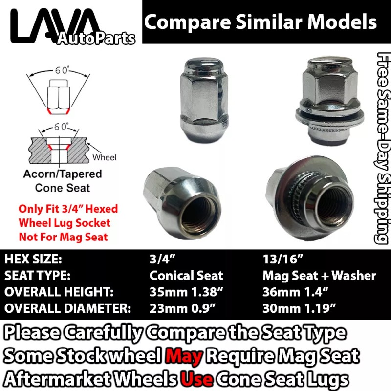 - Only guarantee compatible with 3/4" Hexed Cone Seat Type Required Rim, If you have stock wheel, you may need 13/16" Hexed Mag Seat Lug Nuts for some Brands, Stock wheels fitment is based on knowledge of buyer risk