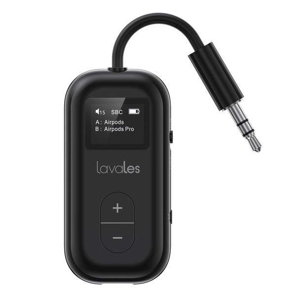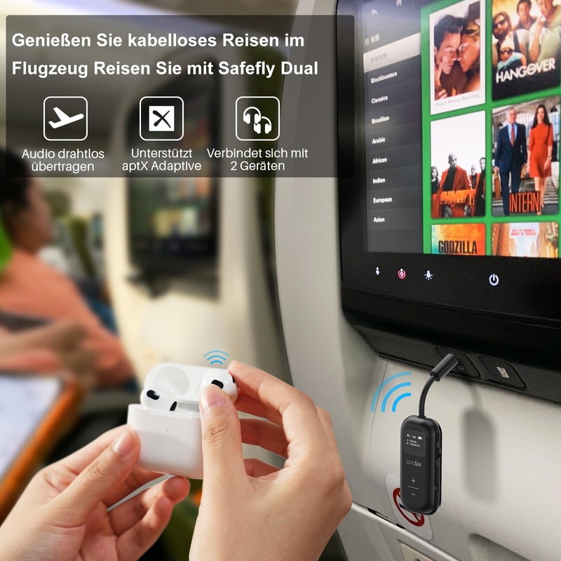 Lavales SafeFly Dual - Premium Aeroplane Bluetooth 5.3 Adapter for 2 AirPods or Headphones, aptX Low Latency, 3.5 mm AUX Jack Audio Transmitter with OLED Display for Air Travel, TV, Tablets