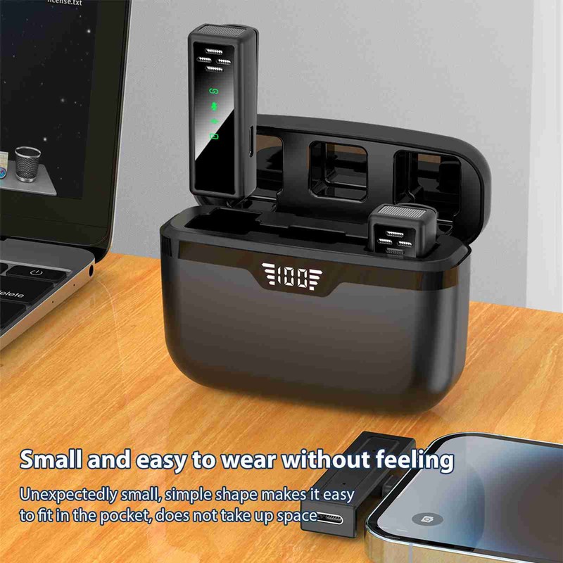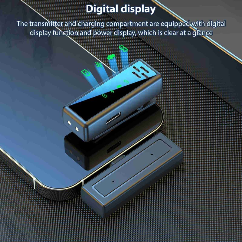 1、Easy to Use with 2.4G Wireless Technology: This wireless lavalier microphone uses 2.4G wireless technology for automatic pairing, offering true wireless freedom. It's incredibly easy to operate - just turn it on and it's ready to use, no other operations needed. 2、Compact and Lightweight: The microphone is small, lightweight, and has a minimalist design, making it easy to carry around. It can easily fit into your pocket without taking up much space, making it perfect for on-the-go use. 3、Double Noise Reduction: Equipped with a honeycomb structure and an ANC chip, this microphone offers double noise reduction. It can quickly identify the type of noise in your environment and dynamically reduce it, ensuring that only your voice is captured clearly and accurately. 4、Universal Compatibility: This microphone is compatible with a wide range of devices, including smartphones, computers, DSLR cameras, and audio equipment. It features a digital display for easy monitoring of functions and battery life, and it can be used immediately upon plugging in. 5、Long Range Transmission: With an optimized antenna design, this microphone can maintain a stable signal even at long distances. It also comes with a large battery storage box for easy portability and charging, ensuring you never have to worry about running out of power.