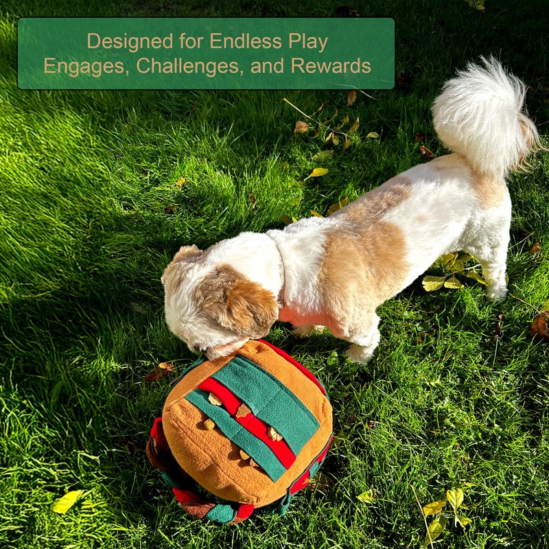 Designed to encourage natural sniffing and foraging behaviors, this treat ball allows you to hide your dog's favorite snacks within its hidden pockets. It's an excellent way to provide dog enrichment and brain stimulation, turning ordinary treat time into an exciting adventure. This toy is perfect for reducing boredom and curbing unwanted behaviors by keeping your dog engaged.
