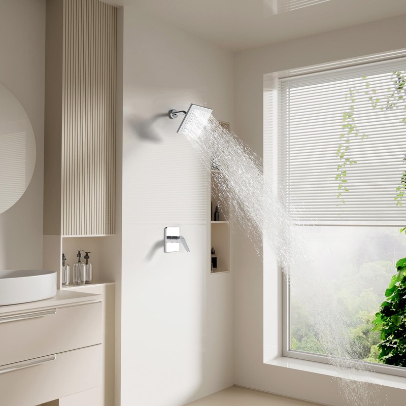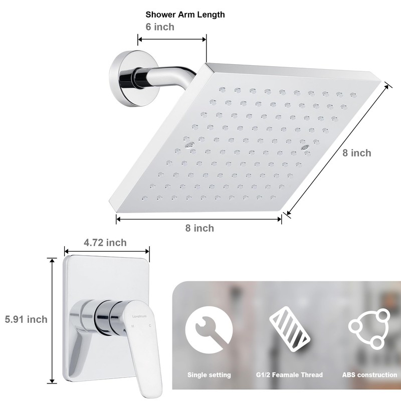 - EASY INSTALLATION: Equipped with NPT 1/2" connectors, it seamlessly integrates with U.S. plumbing standards and most shower trim kits. The package includes a sleek 8-inch square rain shower head(ABS), a wall-mounted shower arm, a precision-engineered solid brass rough-in valve, a stylish trim kit, a robust metal handle, and all essential hardware. This streamlined, single-function shower set is a top choice for both professional plumbers and discerning contractors