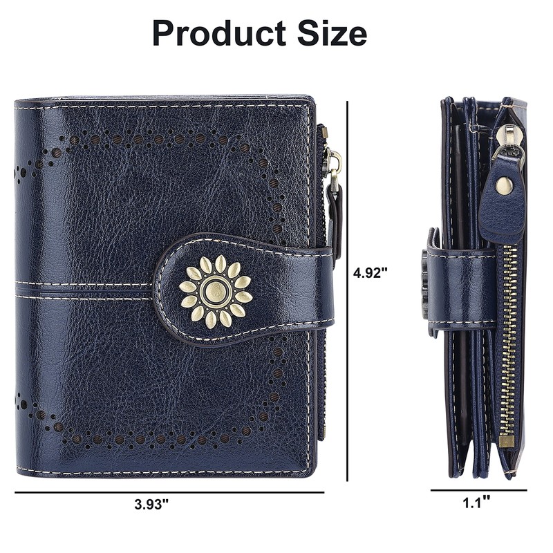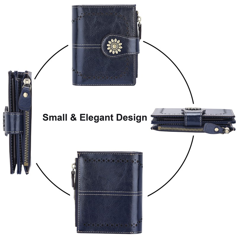 - Piel auténtica: hecha de piel de vaca de alta calidad. Más tiempo que usos, más agradable se vuelve. Compacto pero lo suficientemente pequeñoo ponerlo en el bolsillo de tu abrigo o en tu bolsa cruzada. Los diseños de cierre de dos botones hacen que se mantenga cerrada y pla cuando e lle. La mejor opción evitar carteras voluminosas.