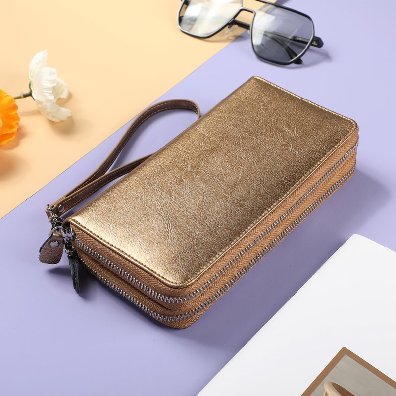 Lavemi Women's 100% Leather Wallets Large Capacity RFID Blocking Two Zippers Phone Holder Clutch Travel Purse(Two Zipper Shine Brown)